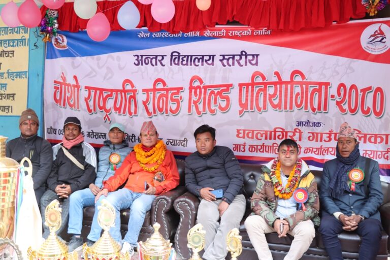 म्याग्दी, ३ पुस । धवलागिरी गाउँपालिकामा गाउँपालिका स्तरीय चौथो राष्ट्रपति रनिङ शिल्ड सुरु भएको छ । वडा नम्बर ७ सिवाङस्थित हेम नमुना आवासीय मावि परिसरमा शुरु भएको प्रतियोगिताको प्रतिनिधिसभा सदस्य खमबहादुर गर्बुजा ‘खम्बिर’ले उद्घाटन गर्नुभयो । ४ गतेसम्म सञ्चालन हुने प्रतियोगितामा ११ वटा विद्यालय सहभागि रहेका धवलागिरी गाउँपालिकाको शिक्षा शाखाका प्राविधिक सहायक ख्यामराज सुवेदीले बताउनुभयो ।