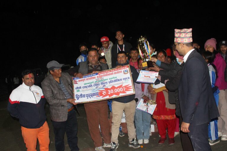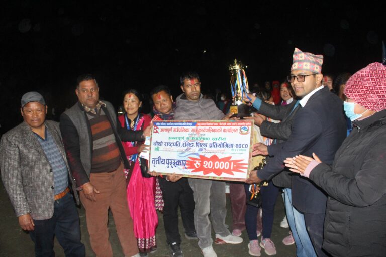 म्याग्दी, ९ पुस । अन्नपूर्ण गाउँपालिकाको पोखरबगरमा आयोजित गाउँपालिकास्तरीय चौथो राष्ट्रपति रनिङ शिल्ड खेलकुद प्रतियोगिताको उपाधि प्रभा मावि नारच्याङले जितेको छ । अन्नपूर्ण गाउँपालिकाको आयोजनामा शनिबार पोखरेवगरमा सम्पन्न प्रतियोगितामा १० स्वर्ण, पाँच रजत र ६ कास्य पदक सहित प्रभा माविले उपाधी जितेको हो ।