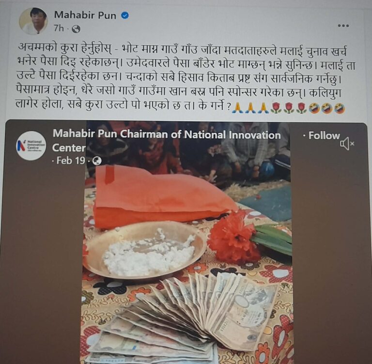 सामाजिक सञ्जालमा उनले लेखेका छन् – भोट माग्न गाउँ गाउँ जाँदा मतदाताहरूले मलाई चुनाव खर्च भनेर पैसा दिइरहेका छन्। उम्मेदवारले पैसा बाँडेर भोट माग्छन् भन्ने सुनिन्छ। मलाई त उल्टै पैसा दिइरहेका छन्।