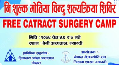बेनीमा चैत ५, ६ र ७ गते नि:शुल्क मोतिया विन्दु शल्यक्रिया शिविर हुने