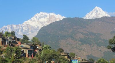 राखु हटियाँ गाउँ र पृष्ठभूमिमा निलगिरी र अन्नपूर्ण हिमाल